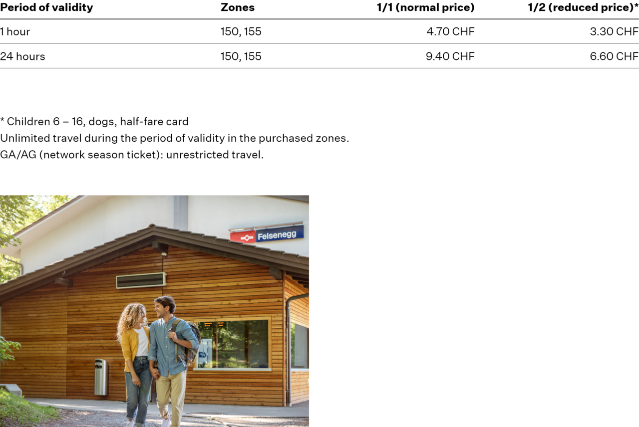 ZVV tickets for zones 150 and 155 may be used to ride the Felseneggbahn. Tickets for zones 110 and 150 require a connection ticket for 1–2 zones.